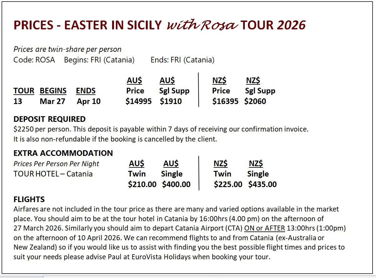 - This carefully-crafted special itinerary provides for a comprehensive but leisurely-paced programme of sightseeing, daily excursions, scenic drives and privately guided tours, highlighted by attendance at three of the most famous Sicilian Easter festivals...the Procession of the Mysteries of Trapani (Misteri di Trapani), the Arbėreshė Procession in Piana degli Albanesi and the Dance of the Devils (Ballo dei Diavoli) in PrizziFully escorted by Rosa and Colin, with additional services in Sicily from a professional Tour Manager and additional expert commentary by local guides during tours and visits while in Piazza Armerina (Villa del Casale), Agrigento (Valley of the Temples), Monreale, Palermo and SyracuseA limit on tour numbers to a maximum of 18 guests ensures a greater level of comfort and individual attentionStart each day with a delicious buffet breakfast (B)On 7 special days savour pre-arranged highlight lunches, three particularly special ones being a long lunch at the exclusive Tenuta Manca di Geracello near Piazza Armerina, a 'Cooking Class' lunch with Rosa at her favourite restaurant in Modica and a 'Farewell Lunch' at a Michelin-starred restaurant in the beautiful town of Noto (L)6 evening meals are provided, with wine, including a welcome dinner in Catania and a dinner in each of Rosa's favourite restaurants in the Piazza Armerina area (2), Marsala, Palermo, and Syracuse (D)Experience the delightful tastes of the Sicilian Easter Festivals with dishes like Torta Pasqualina (Easter Pie) and Agnello Agrassato (Lamb Stew) or Mpanata (Lamb Pie). Enjoy the famous Easter treats such as Cuddura (hard boiled eggs nestling on animal or basket shaped pastries, traditionally made by the Nonnas and gifted to their grandchildren) and Colomba Pasquale (Panattone-style Easter bread baked in the shape of a dove). Try the iconic Easter gift, Agnelli Pasquali (Spring lambs fashioned from marzipan and filled with pistachio paste)Stay in quality accommodation, in boutique-style, premium city hotels or intimate family-run establishments with a special highlight of a 2-night stay at an 'Agriturismo' property in the Piazza Armerina areaTravel in comfort and style in deluxe air-conditioned vehicles throughout, with private transfers on arrival and departureAnd, you won’t have to tip on this tour. The Easter in Sicily with Rosa tour has a unique 'No Tipping' policy which means we take care of hotel porterage, hotel and restaurant service charges (for meals included in the programme) plus taxes and gratuities, including gratuities for local guides and the end-of-tour gratuities traditionally given to the Tour Manager and Driver